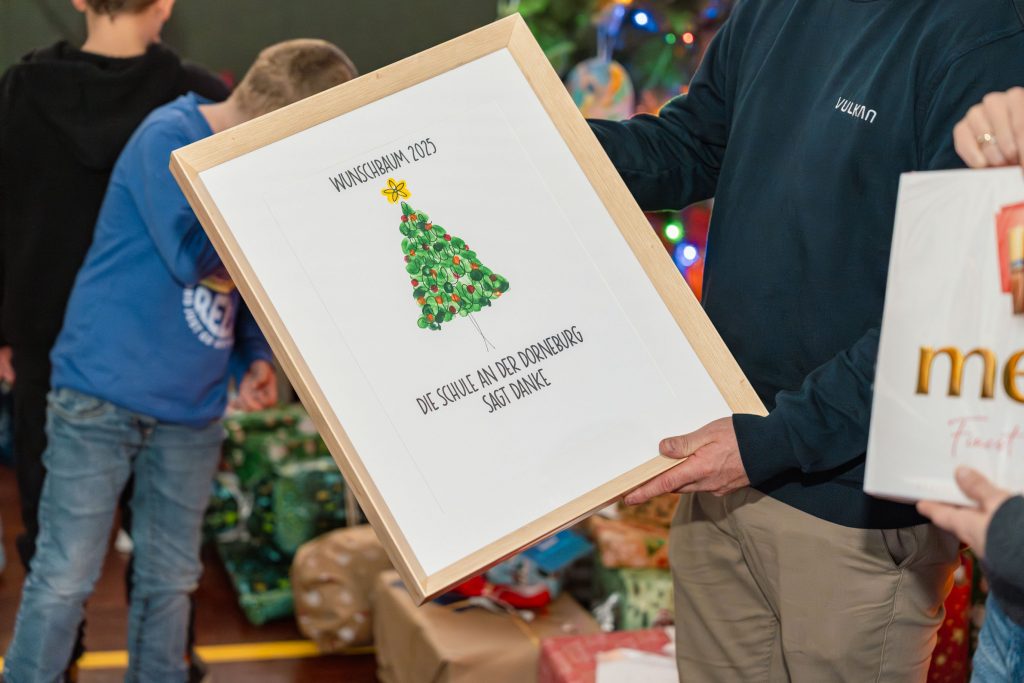 Bei unserer diesjährigen Weihnachtsfeier durften sich die Schülerinnen und Schüler der Schule an der Dorneburg über eine ganz besondere Überraschung freuen: Die Firma VULKAN hatte im Rahmen einer großzügigen Wunschbaumaktion alle zuvor gesammelten Wünsche unserer Klassen erfüllt und liebevoll verpackt zur Schule gebracht. In der festlich geschmückten Turnhalle, mit Weihnachtsbaum, Lichterketten und Musik, wurden die bunt gestalteten Pakete klassenweise überreicht und von den Kindern mit sichtlicher Spannung und großer Freude entgegengenommen. Beim Auspacken kamen Kuscheltiere, Spiele, Bücher und viele weitere Wünsche zum Vorschein, sodass die Augen der Kinder förmlich leuchteten. Als Dankeschön überreichte die Schulgemeinschaft ein von Schülerinnen und Schülern gestaltetes „Wunschbaum 2025“-Bild und brachte so ihre Wertschätzung für das Engagement der VULKAN-Mitarbeitenden zum Ausdruck.