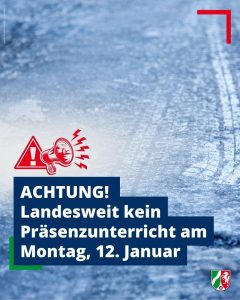 Liebe Eltern und Erziehungsberechtigte, auf Anordnung des Ministeriums für Schule und Bildung des Landes NRW findet am Montag, den 12.1.2026 kein Unterricht statt! Der Grund ist eine Warnung vor Glatteis in den frühen Morgenstunden. Bitte geben Sie diese Information auch an andere Eltern und Erziehungsberechtigte weiter, mit denen Sie in Kontakt stehen.